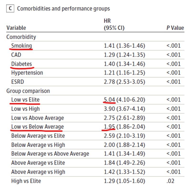 nomirt no jebkura cēloņa ir par 95 % augstāks esot zemākajā VO2 max grupā [